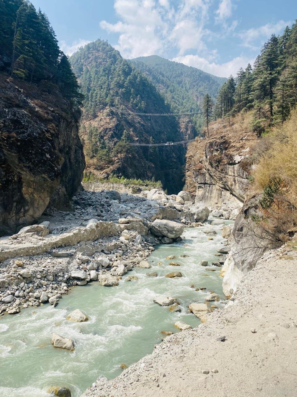 Finally, the route dips considerably today. And we'd be crossing the rapids of the Dudh Koshi via suspension bridges. Despite the fact that we would be taking the same path, we could have completely different perspectives. Take as many photos as you can of the broad plains, rhododendron and pine trees, and a snow-covered peak in the distance. Stay in Lukla for the night.